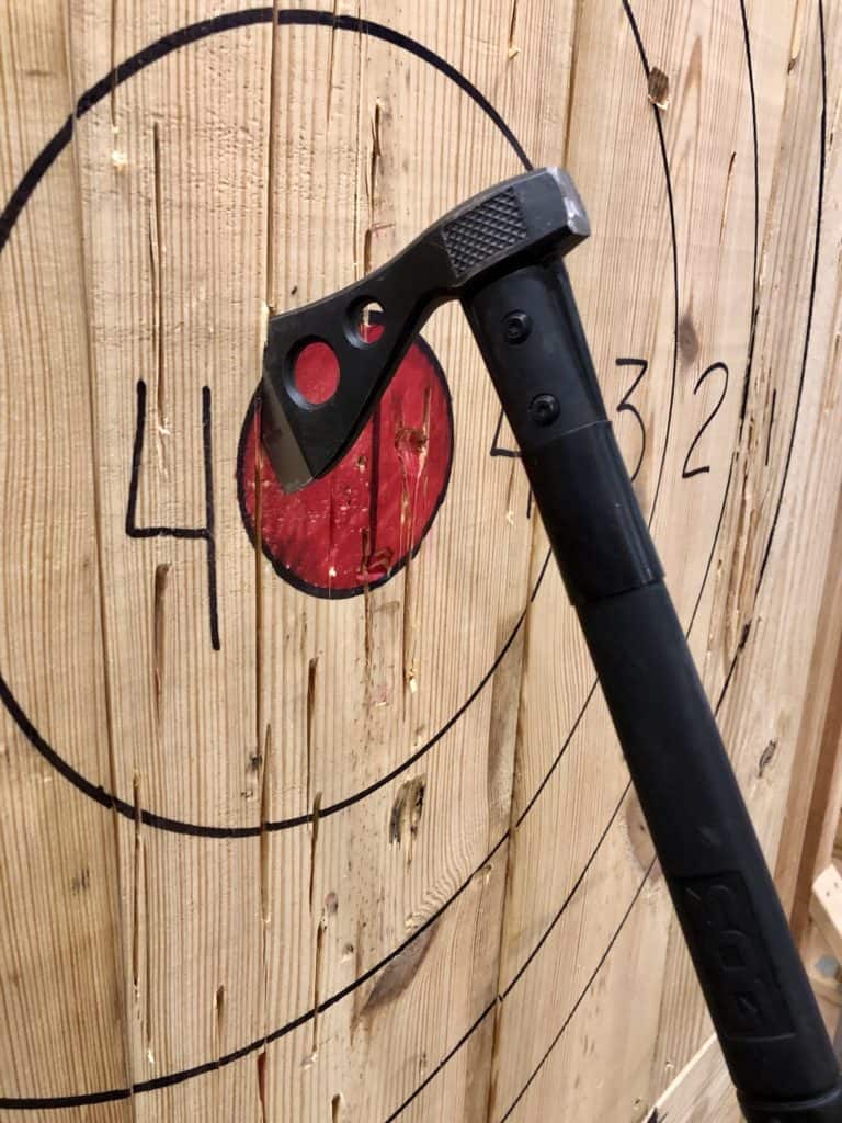 At one point, I decided that I’d go back to throwing the first axe to see if I could hit the target just one more time with it. I ended up throwing it so hard that the form was off and the angle that the blade hit the wood chipped off some wood (about the size of my finger) and it came flying right at my face! By the time I even realized the wood chip was flying, I had a split second to take a step back and luckily, I did, because it ended up hitting my cheekbone. That could’ve been much worse! I put that axe down and decided to retire it from any further participation.