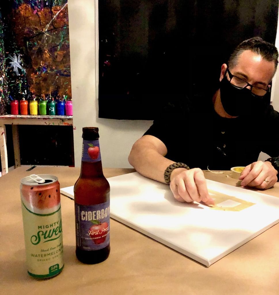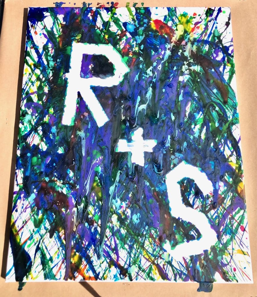 I made a reservation for late Saturday afternoon and the place was empty when we got there. The friendly staff (who had masks on) showed us to our room, explained to us how things worked, took our drink orders, and got us started on our pre-painting prep – which was basically putting masking tape on the parts of the canvas where we didn’t want to have paint. We kind of failed under pressure and went for the unoriginal option, using the first letters of our names: R+S. Just as we finished our prep, our drinks and sweets platter arrived. It was nice to be able to be in the room alone, and I actually felt safe to remove my mask to eat and drink. (The staff always knocked before entering, so we had time to put our masks back on.) Finally, it was time to do what we came for … make a mess – I mean, create art!