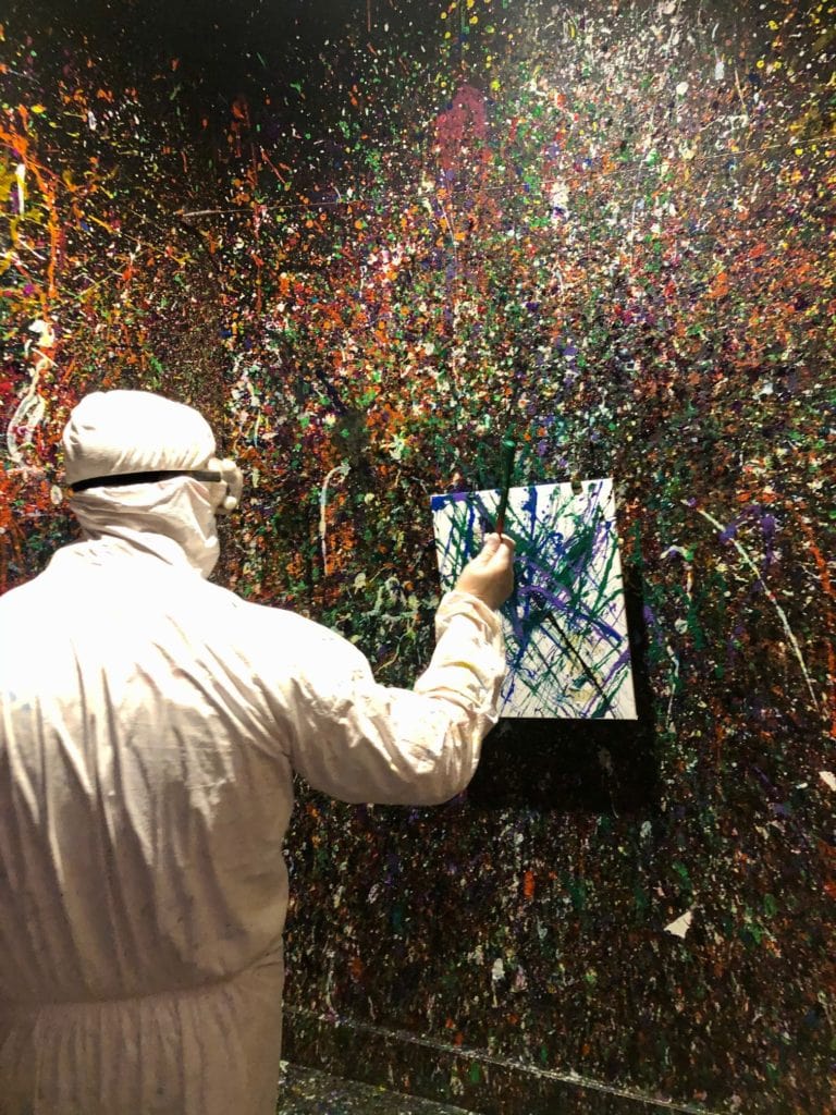 The staff brought us fresh jumpsuits, paper booties, and head coverings as well as sanitized goggles. They hung our canvas in the “painting” area and explained how things worked. They showed us how to turn off the lights, if we chose to use the glow-in-the-dark colors, and even gave us control over the music. Then, they left us to don our gear and get to work. The outfits are not the most attractive thing, but they are a must because splatter paint does just that … SPLATTERS everywhere! At first, I was a bit timid. You know, the mom in me didn’t want to make a mess that others would have to clean up. But it didn’t take long for that feeling to be replaced with “Let it rip!”