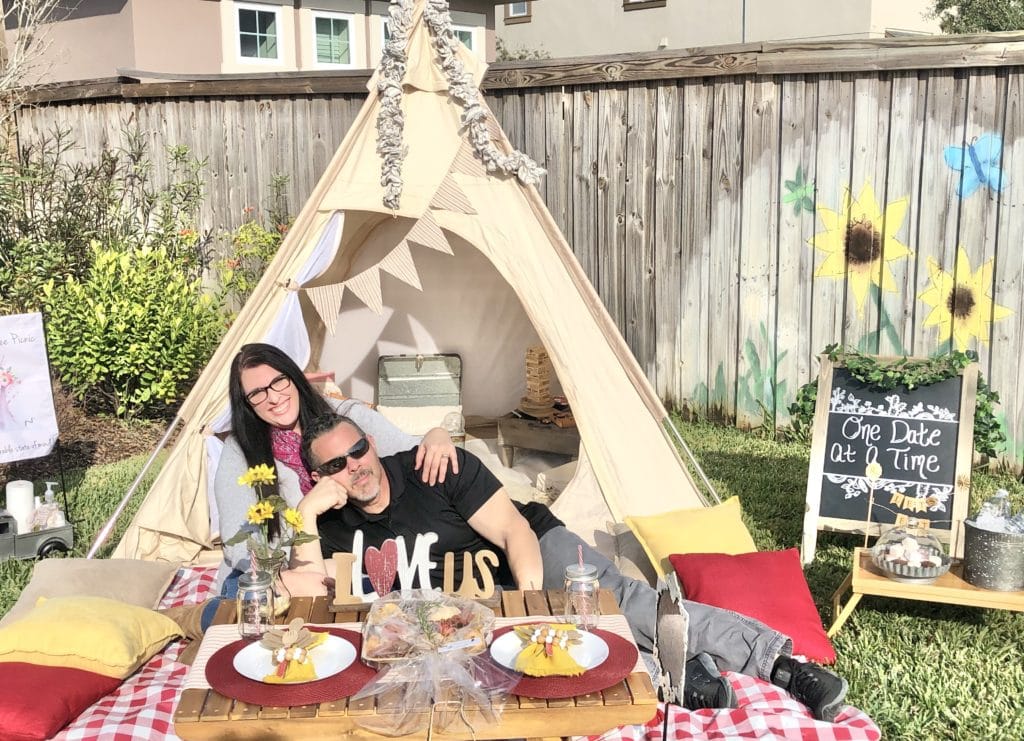 We chose the Southern Comfort theme because I thought it would look best with our backyard and the rustic feel we created for it. It was perfect! Kathy texted me half an hour before our scheduled time to see if there were any special instructions about setting up. After directing her on how to get into our back alley, she and her husband, Omar, arrived, wearing masks and gloves, ready to set up. I couldn’t help but chat with the couple a bit as they worked. Kathy told me that Omar is her biggest supporter, and we saw firsthand how true that is. Besides being such a nice couple, they were so professional. EVERY detail was thought of, even bug spray and hand sanitizer! In almost no time, they transformed our backyard into a beautiful getaway, where Hubby and I were able to escape and enjoy each other’s company.