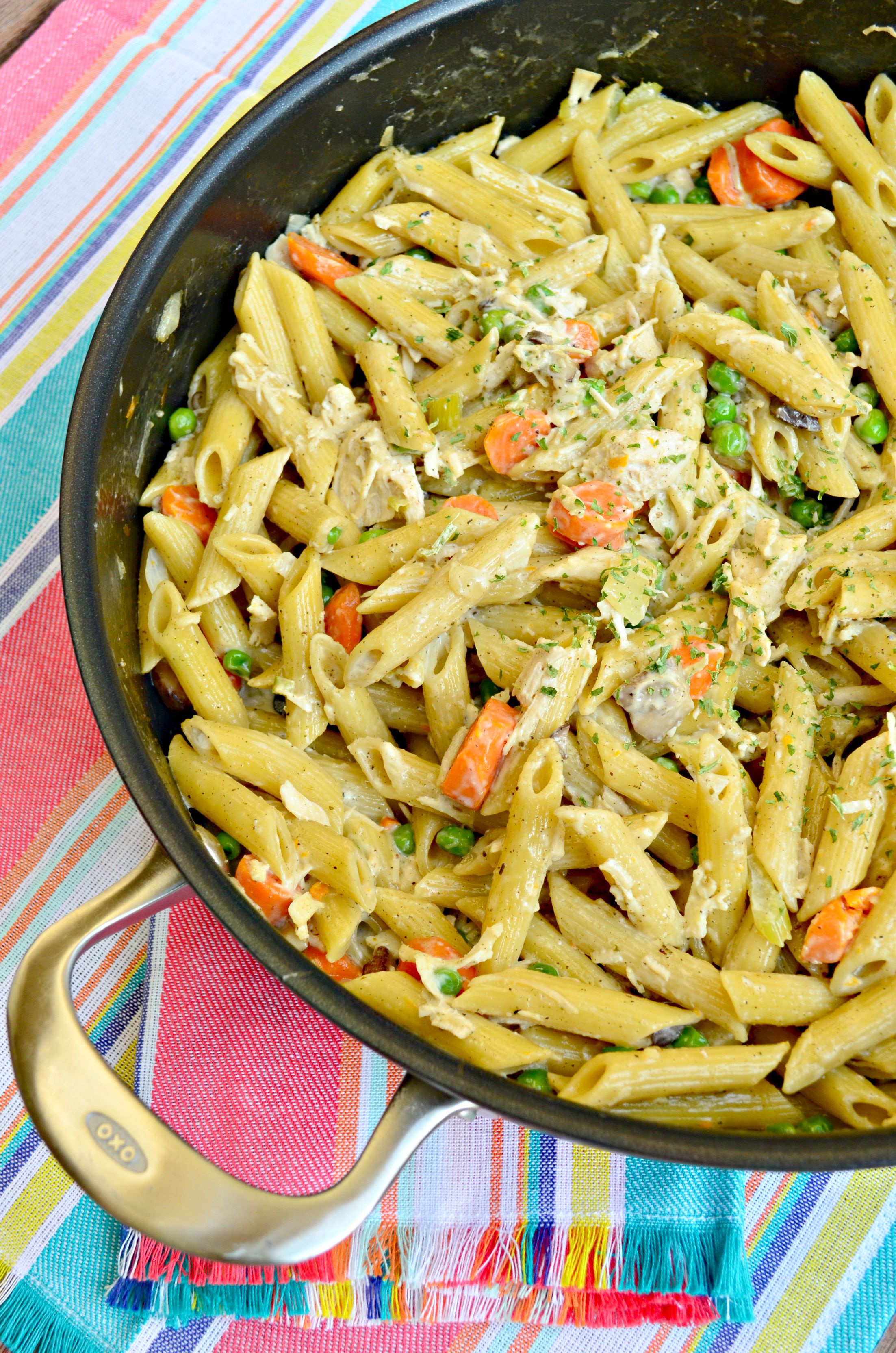While the pasta cooks, in a small bowl I’ll mix together the heavy cream and cornstarch and set that to the side. Then, once the pasta is done cooking, I’ll turn off the heat and add in the cooked, chopped rotisserie chicken. Then I’ll mix in the heavy cream mixture and let it stand in the skillet for at least five minutes with the lid on. I’ve let it rest for up to a half an hour before, and it was still delicious. The sauce will be thicker instead of a thinner consistency. If you happen to reheat the one-pot chicken pot pie pasta the next day, pour a little heavy cream on top to keep the pasta moist and saucy! Trust me, you’ll be happy you took my advice. If you’re looking for a new dinnertime favorite, try my recipe for one-pot chicken pot pie pasta.