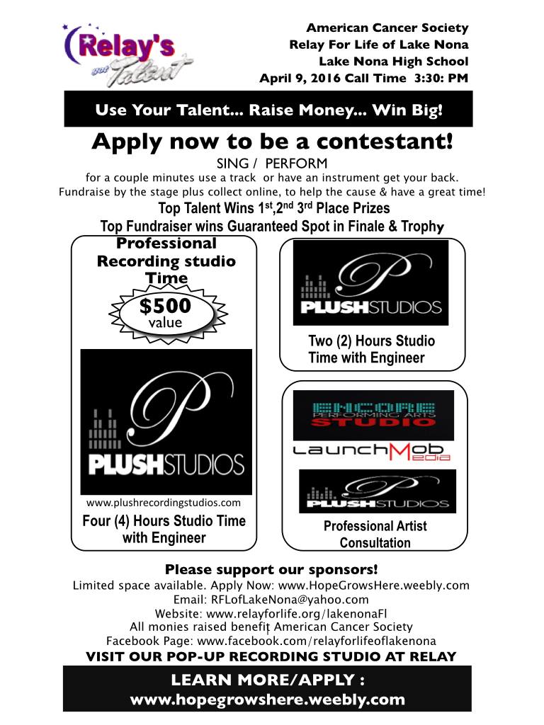 It’s like American Idol but RELAY STYLE and there are 3 GREAT PRIZES with the top one being 4 hours in a professional recording studio!!!!