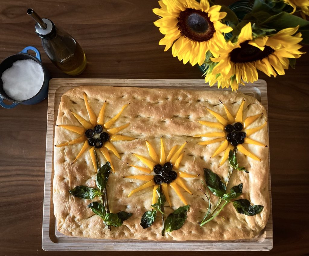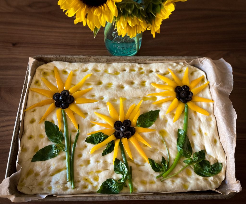 There’s focaccia, and then there’s garden focaccia; part snack, part art! During lockdown, many of us tried our hand at baking. Some patiently tended to their sourdough, others brought back the classic banana bread, and more artistic bakers with time on their hands began the trend of garden focaccia. I like to imagine Italian bakers shaking their heads at Americans for turning their beloved national bread into something “Pinterest-worthy,” but I think it’s a trend worth the scrutiny. After a quick Google image search, I know you’ll get inspired. As it is spring, I opted for florals. To show a small token of support for Ukraine, I chose a sunflower, the Ukrainian national flower.