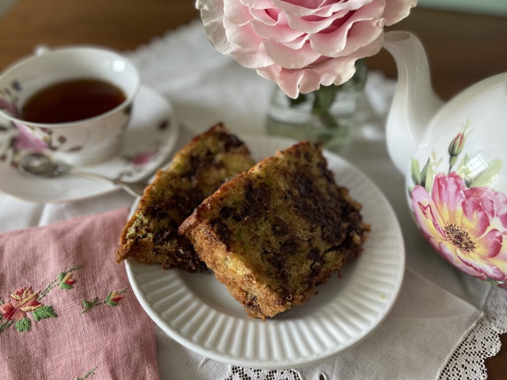 There is something so homey about warm bread baking in the oven to serve for a weekend breakfast or a tea time snack. The shredded zucchini adds moisture to the finished bread without any perceptible vegetal flavor. This makes an excellent end of summer, early fall recipe, using the last of the precious summer zucchini. Even the pickiest eaters won’t know there are vegetables lurking in this chocolate-laced bread.