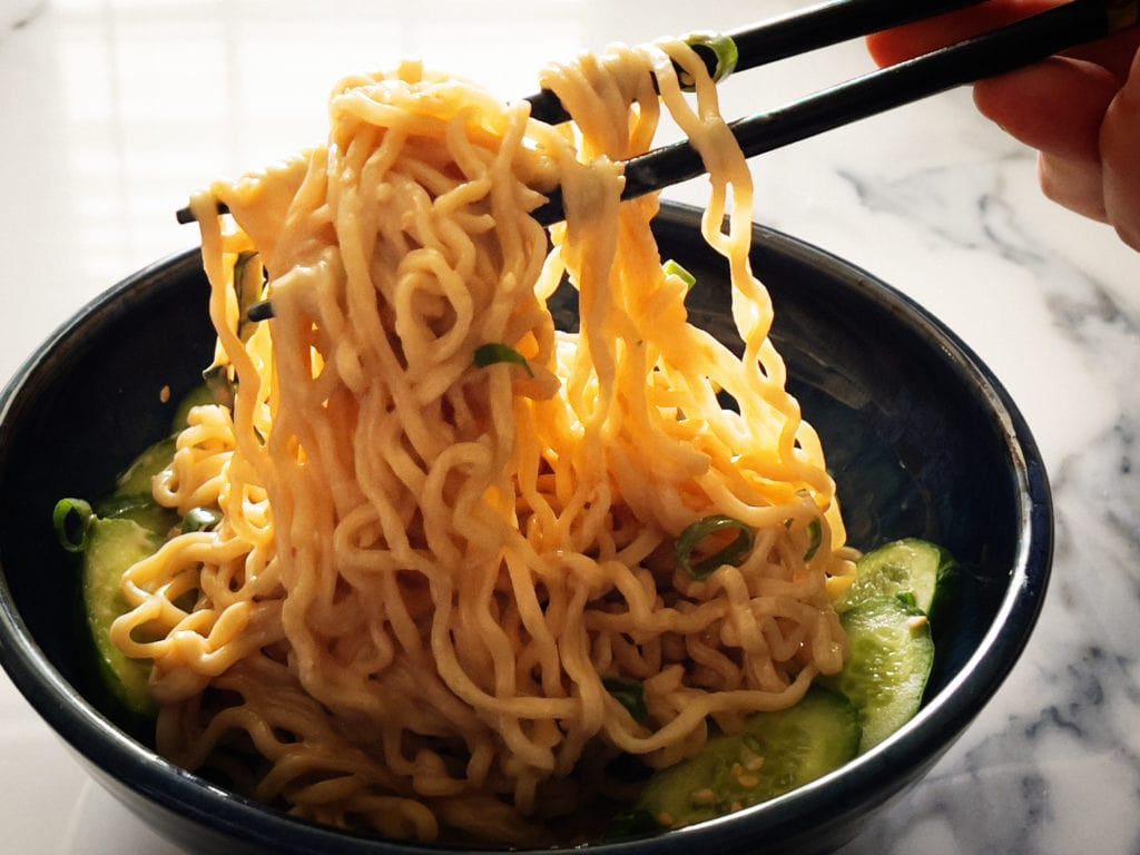 Now to the noodles! These noodles are so simple and delicious. Simply cook, drain and chill the noodles. The sauce requires no cooking. I used ramen noodles from the soup aisle and ditched the packets, but if you’d rather use pasta, linguine makes a fine substitution. Add a few cucumbers, green onions or basil, and a sprinkle of toasted sesame seeds, and you’ve got a cool, refreshing summer dinner.