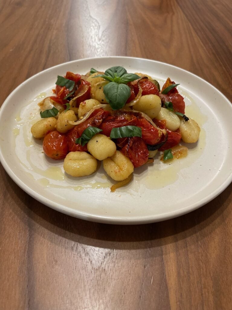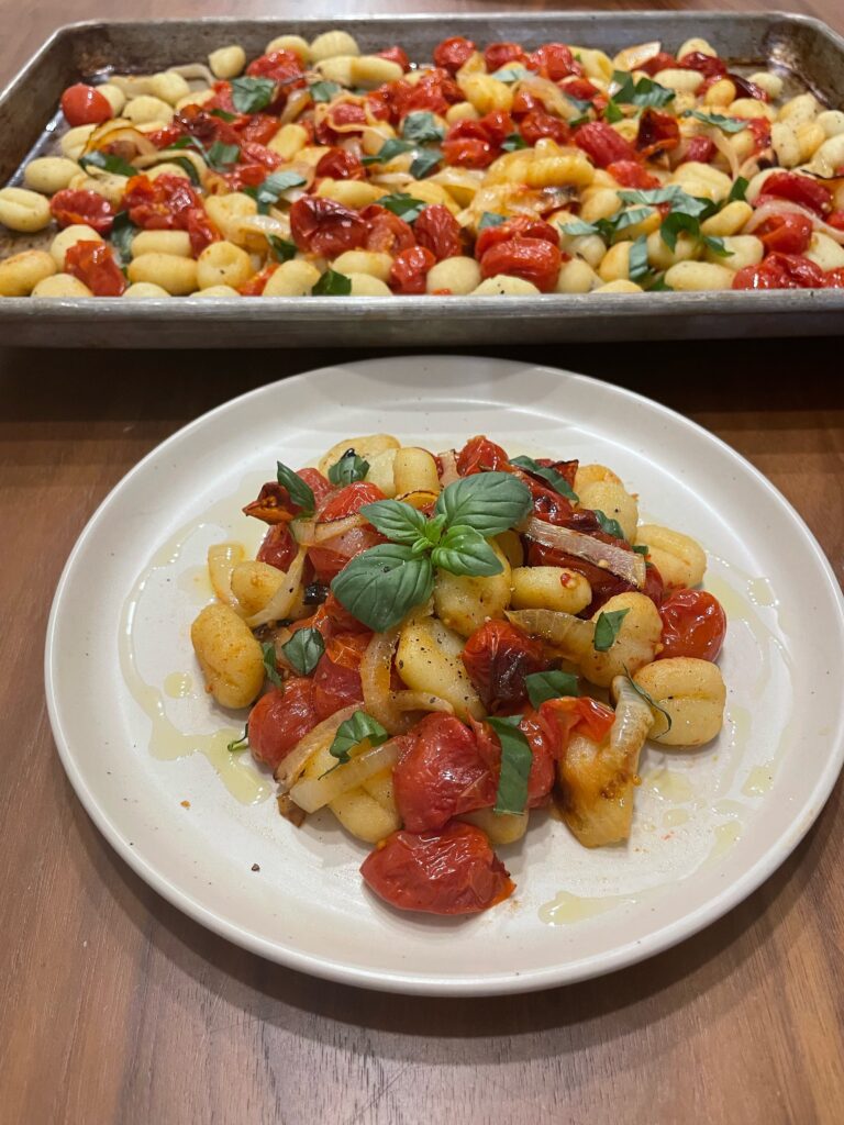 What is a sheet pan meal, you ask? Well, a sheet tray (a baking sheet) is a necessary tool. Actually, I use two for this recipe. Essentially whatever vegetables and proteins you enjoy and uncooked packaged potato gnocchi. I first tasted this meal at my best friend’s house and her combination was: chicken thighs, red onion, Brussels sprouts, gnocchi, olive oil and dried oregano. Never in my life had I considered cooking gnocchi in the oven, but they emerge from the oven fully cooked, a little caramelized and full of flavor from the surrounding ingredients. It was fantastic, and I immediately thought of ways to personalize my own. My favorite easy meal is pasta with roasted tomatoes, so I merged the recipes here for you today. In a large bowl, toss together one sliced yellow onion, two pounds of uncooked potato gnocchi, two whole pounds of cherry tomatoes with olive oil, salt and pepper. No need to cut the tomatoes. Get two sheet trays and divide the ingredients between the two pans. You definitely always want to avoid crowding the sheet trays whenever you are roasting vegetables. No one wants steamed vegetables when going for supremely caramelized roasted vegetables. Simply arrange them on the trays and roast at 425 degrees for 30-35 minutes. You may need to stir with a wooden spoon halfway through to ensure that none of the ingredients is burning or sticking. This recipe serves 6-8 people but can very easily be halved. After removing from the oven, you can add grated Parmesan cheese and fresh basil. For a vegan or dairy free option, adding a drizzle of nice balsamic vinegar adds extra flavor in lieu of Parmesan.