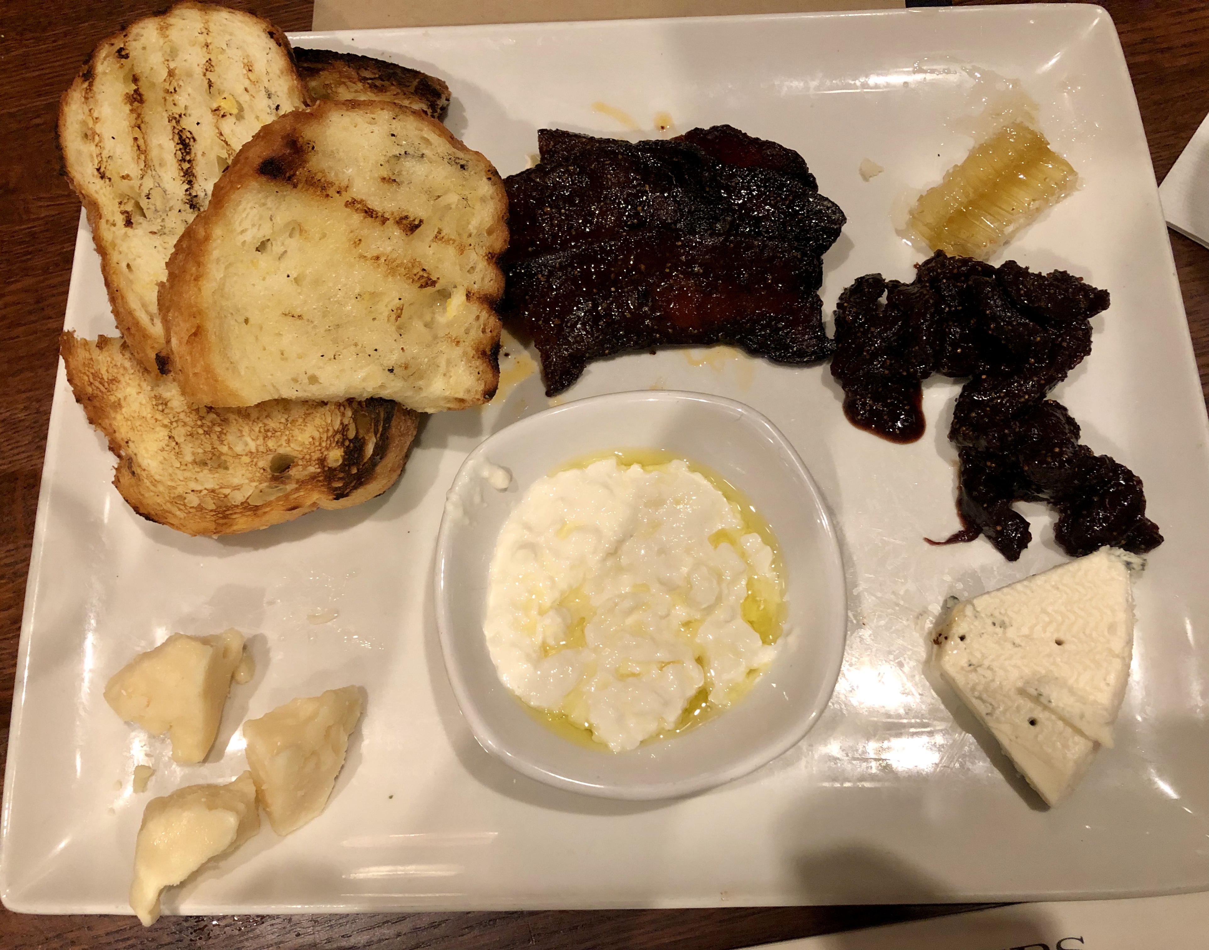 The cheese plate found its way on to my table, and I was instantly delighted. Roughly eight pieces of candied bacon. I’m talking sticky, sweet deliciousness! Was it possible I was looking forward to the bacon more than the cheese at this point? POSSIBLY. The plate also adorned raw honeycomb (YUM!), black fig jam, grilled polenta crostini, and three different kinds of cheese: Buttermilk Bleu, Sartori Parmesan, and Stracciatella (a cheese I’d yet to discover). Let the digging in commence!