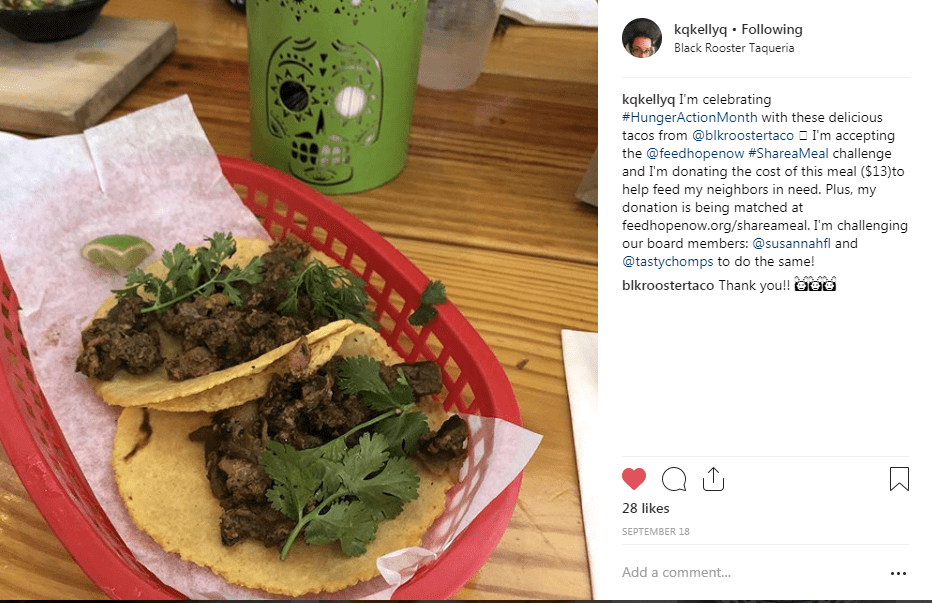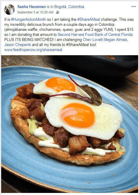 The food is utilized for people in need by emergency food pantries, soup kitchens, shelters, and other organizations serving families in need. By challenging friends and family to take action in the fight against hunger, while also using social media as a tool for change, participants photographed themselves enjoying a meal and then posted it on social media using the appropriate hashtag. The person who created the post got to use their own platform to announce their commitment to donating to struggling families and help them get the food assistance they need. Donation amounts to Second Harvest Food Bank after their meal were based on the cost of the meal in their picture, or any amount they wish to give. Share A Meal donations are accomplished online using a credit or debit card. Each post also contained a challenge to at least three other users to do the same challenge, thus keeping the ball rolling in terms of creating an impact.