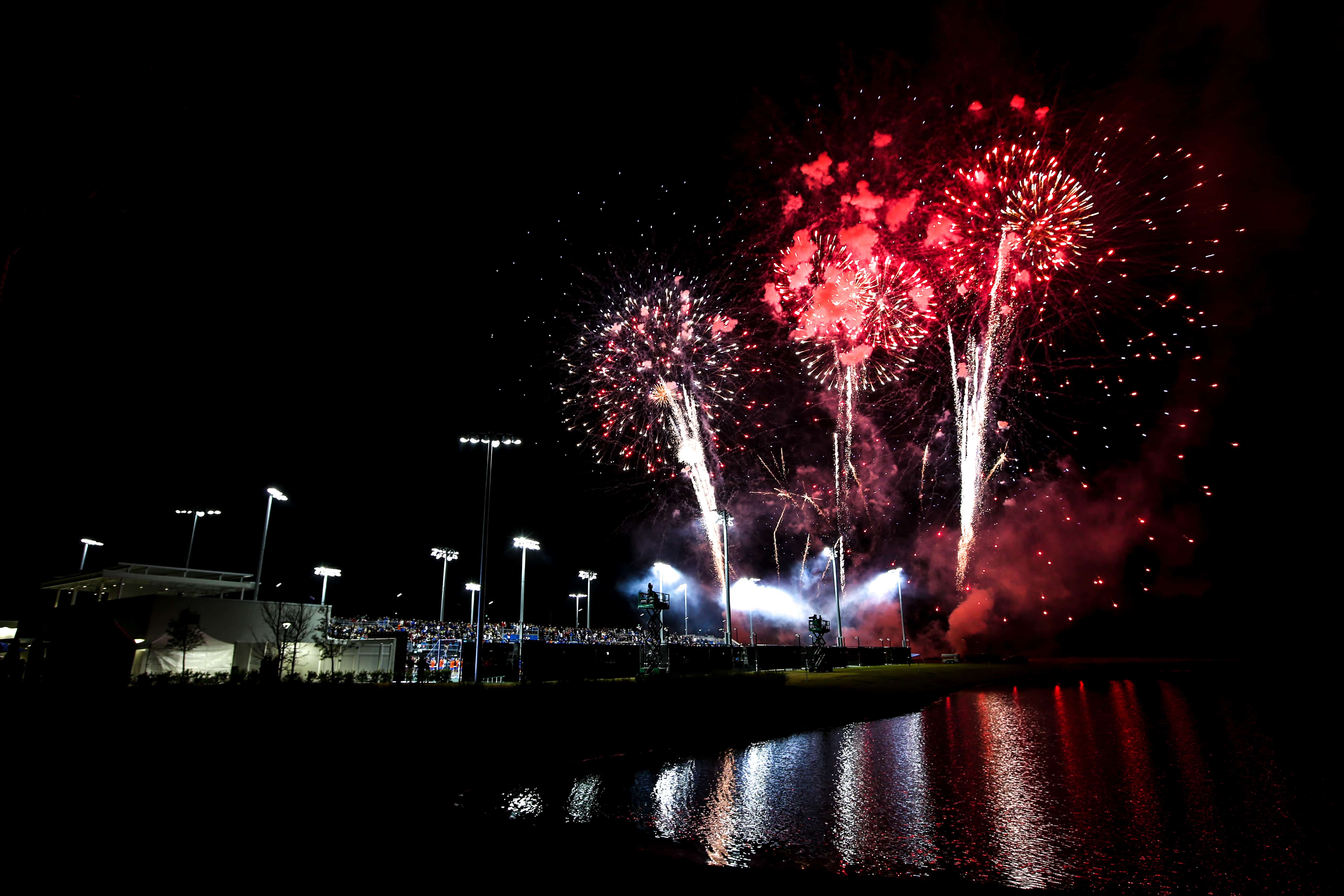 I’m a UCF alumna covering College MatchDay between FSU and UF on February 4th. Excuse me while I look down and quickly realize I’m wearing black and gold(ish) attire. I didn’t plan that (at least not consciously). I arrive at the USTA National Campus to fireworks being shot off. The nice, chilly weather made for a pretty perfect night of sports. This was virtually a sold-out MatchDay with a record crowd of almost 2,000 fans. The match also was aired live on the Tennis Channel to a national television audience. The orange and blue clashed with the gold and garnet in the stands.