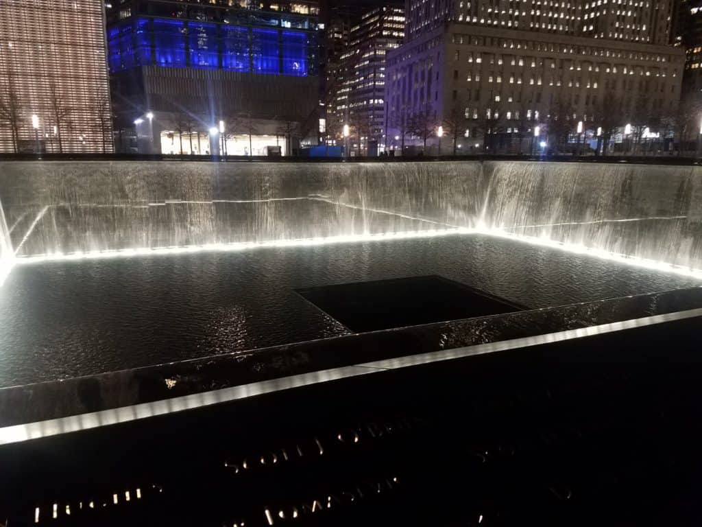 Afterwards, we ended the night by walking past the new World Trade Center, which is called One World Trade Center. We then arrived at the National September 11 Memorial & Museum, where we ended the workshop. I did not go into the museum since I was a little pressed for time. However, I did stick around to gaze at the memorial. It was nighttime, and the air was so crisp and bitterly chilly. Looking at this vast square structure they had built in place of the World Trade Center with water pouring down the sides into a mysterious dark opening in the middle left an airy feel. It was slightly haunting with a hint of peace.