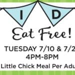 Join us for our Kids Eat Free Summer Nights on Tuesday July 10th and Tuesday July 24th! 4pm - Close. Enjoy 1 Free Little Chick's Meal with the purchase of 1 Adult Chick Special. Bring the family and enjoy a fresh & delicious meal at The Chick! ***ONE FREE KIDS MEAL PER ADULT CHICK SPECIAL PURCHASE … [Read more...]