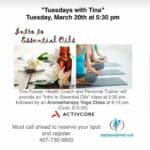 Introducing Tuesday's with Tina at Regenerative Sport Spine and Spa w/Activcore Physical Therapy and Performance. 5:30 PM - Intro to Essential Oils 6:15 PM Aromatherapy Yoga Space is limited so please call 407-730-5600 to secure a spot Learn about the benefits of essential oils with aromatherapy yoga with Tina Fusser. Tina is a personal trainer, yoga teacher, and health … [Read more...]