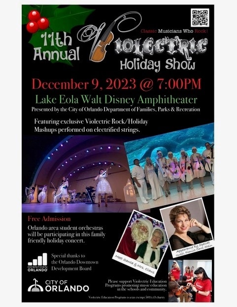 Performing together LIVE on stage, renowned “Vinylinist” and Founder of Violectric® Michelle Jones and the talented musicians of the Central Florida strings super-group announce the exciting 11th Annual Violectric® Holiday Show rocking into the Walt Disney Amphitheater at Lake Eola Park on Saturday, December 9, 2023 starting at 7pm. FREE and open to the public, the 90-minute live concert presented by the City of Orlando Department of Families, Parks and Recreation will feature traditional holiday songs like O Christmas Tree, The First Noel and Hanukkah, O Hanukkah mashed up with classic rock tunes and modern hits like Born to Run, Heroes and Sweet Dreams, delivering a fun-filled, energetic and highly unique holiday show unlike anything seen and heard before and simulcast all around Lake Eola. This year, special guest performers are Pianist Carol Stein, Edgewater High School Orchestra and Howard Middle School Orchestra. Santa and Mrs. Claus will return for meet-and-greets and family photos. Concert goers can also bring a donation to support Violectric Education Programs (VEP), Violectric’s 501(c)(3) not-for-profit music education division. Thru VEP, Violectric performs workshops throughout the U.S., Asia and beyond, including master classes and performances combining Violectric with student string groups.