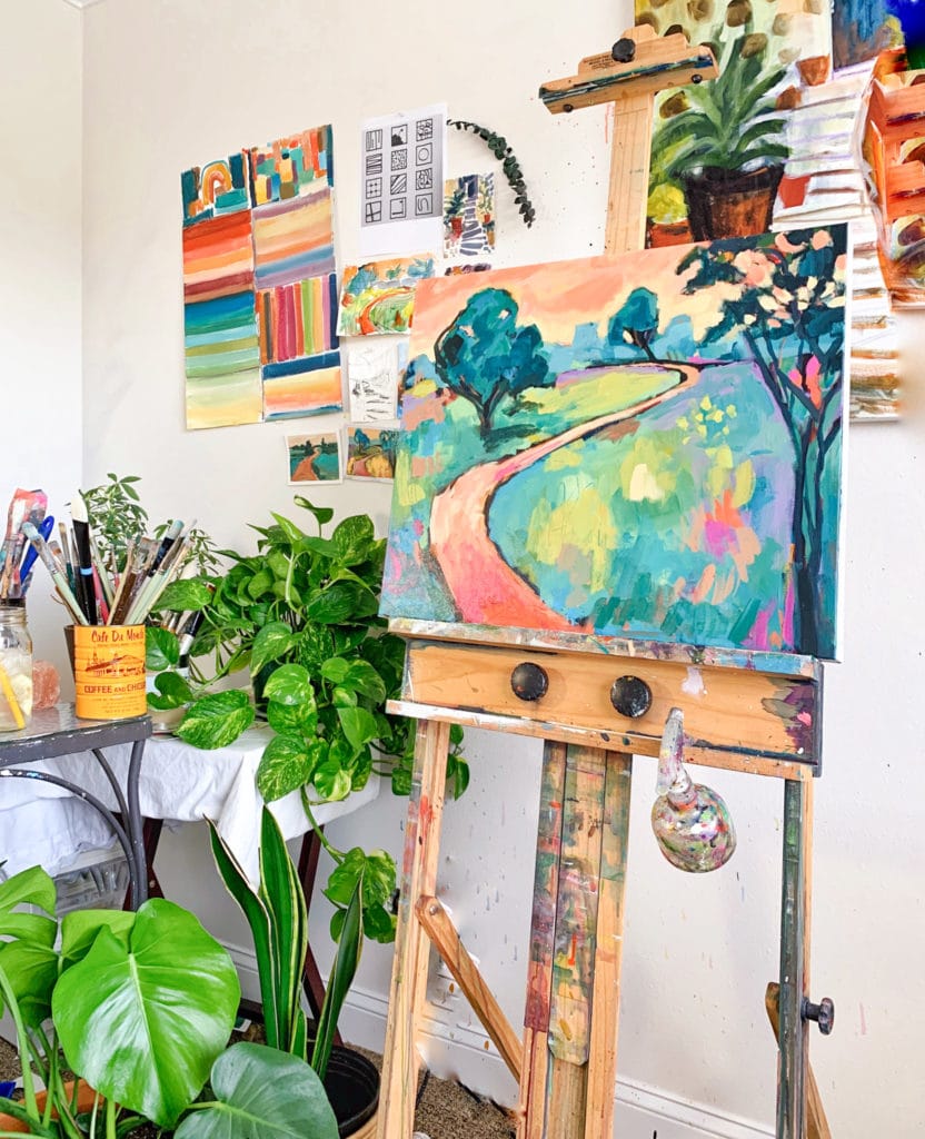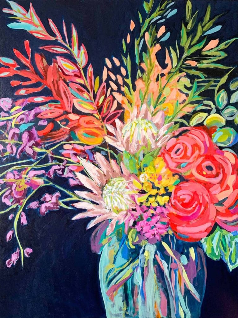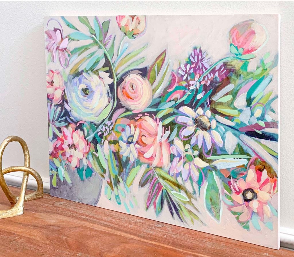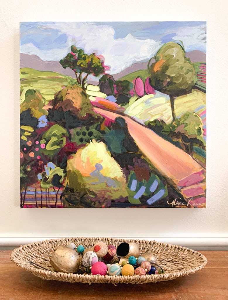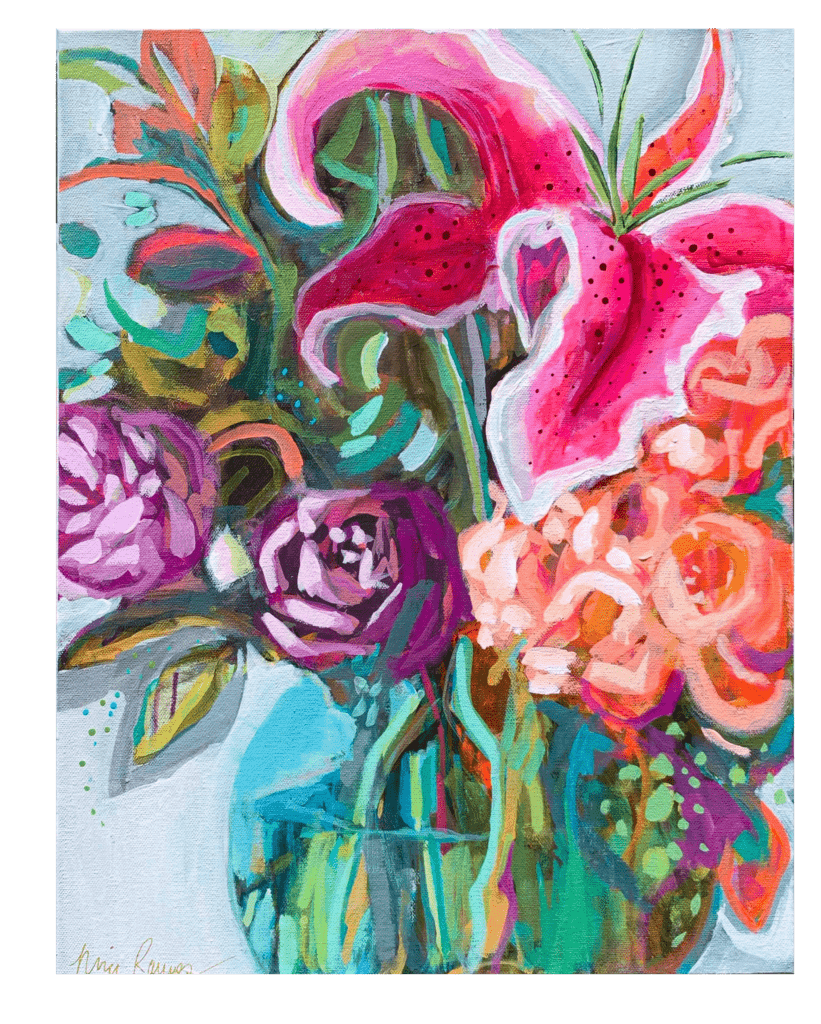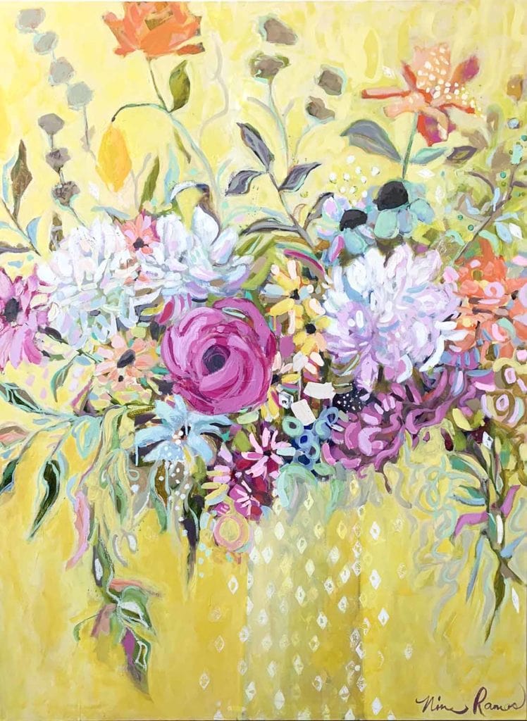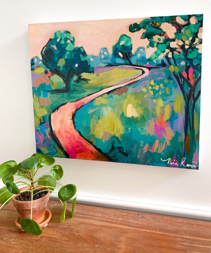 NR: I love painting nature-inspired art – florals and landscapes. If I have to pick one, my Wild Blooms collection has been my personal favorite project to date. This collection has and continues to be a playground for me to explore my developing style and create wildly colorful and energetic paintings.