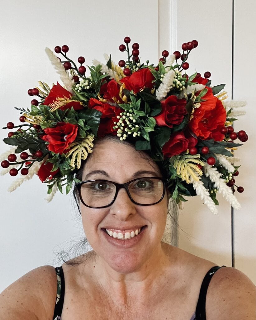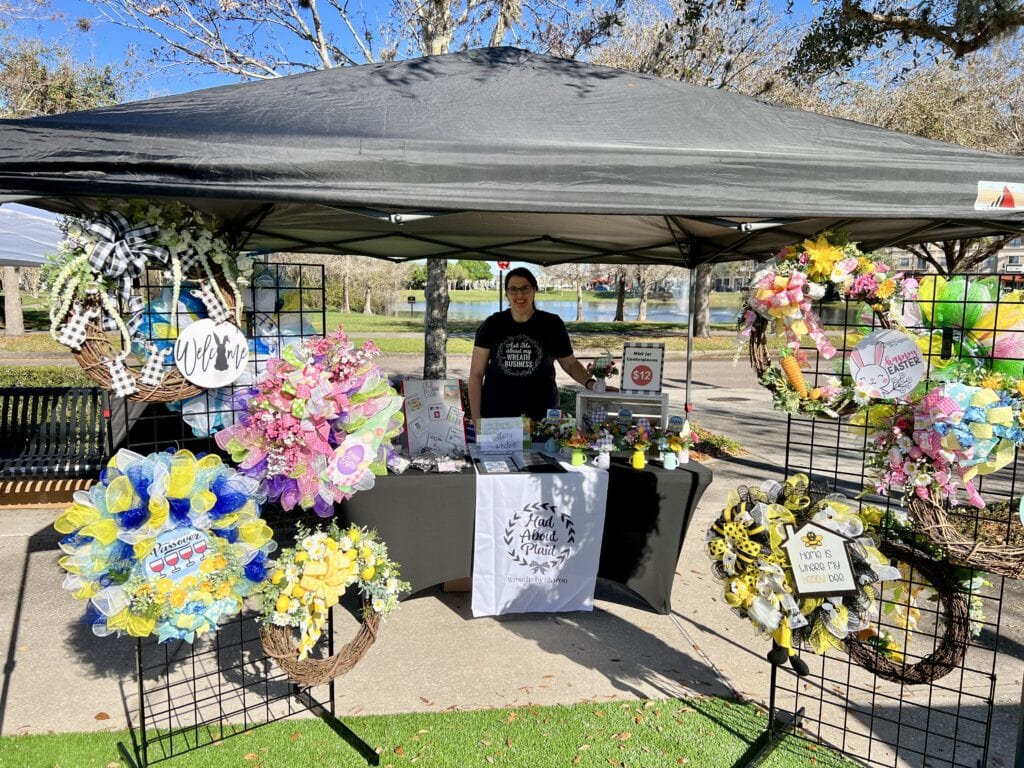Sharon Fuentes: I’ve always been a creative person. I attended a performing arts high school and pursued acting in New York. While I loved theater, I hated the auditioning process, eating ramen noodles, and sharing a one-bedroom flat. So, I moved back to Florida, started writing children’s stories, and hired actors to help me perform them. I enjoyed making the props and puppets more than performing. It should’ve been a clue what I was passionate about, but I wasn’t ready to see that. Instead, I focused on writing. I’ve written and published a book, have had essays appear in several Chicken Soup for the Soul books, and have had articles published in The Washington Post, Nonahood News and several regional and national magazines. When we moved here in 2016, I was still making a living as a freelance writer. I love writing, but during the pandemic, I had a major case of writer’s block. The lack of creative outlet made me anxious. I had to challenge myself, so I decided to learn a new skill: make a deco mesh wreath for my front door. I posted my creations on Facebook, and my friends and family were impressed and wanted me to make them one. Before I knew it, my living room was filled with wreaths. My husband jokingly told me I either needed to open an Etsy shop or we needed to move into a new house with more doors. The Etsy shop idea was cheaper, so I went with that! Now, I’m at the stage of my craft where I’m challenging myself to try new things. That’s how I discovered headpieces, which are my current favorite things to create.