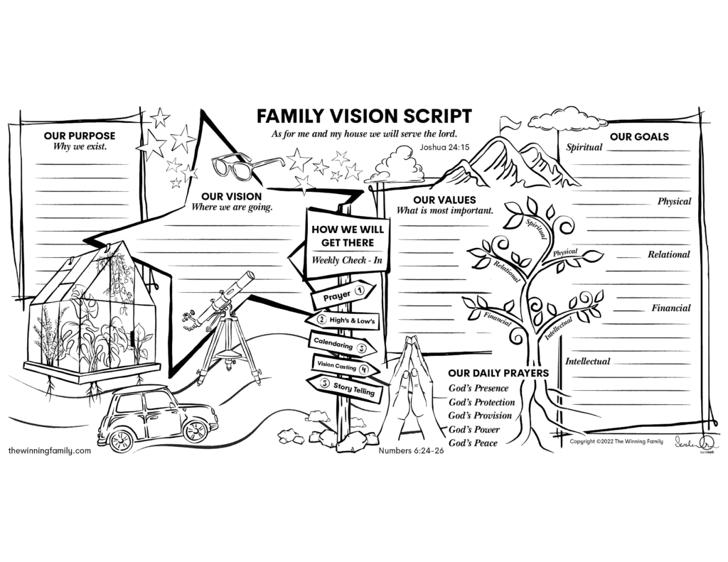 Every person, marriage and family needs an injection of those for four things. At The Winning Family, we have created a fun, life-giving tool we call a Family Vision Script. You can go to thewinningfamily.com and download a FREE copy to print out so you and your family can create your own. After 31 years of marriage, raising three adult children of our own, and working with hundreds of families for over 35 years, I have learned that couples and parents need far more than prayer to survive in today’s world. They need a plan so they can thrive!