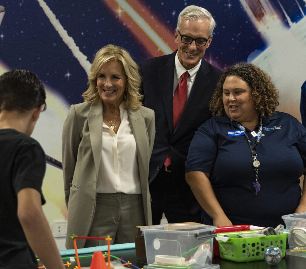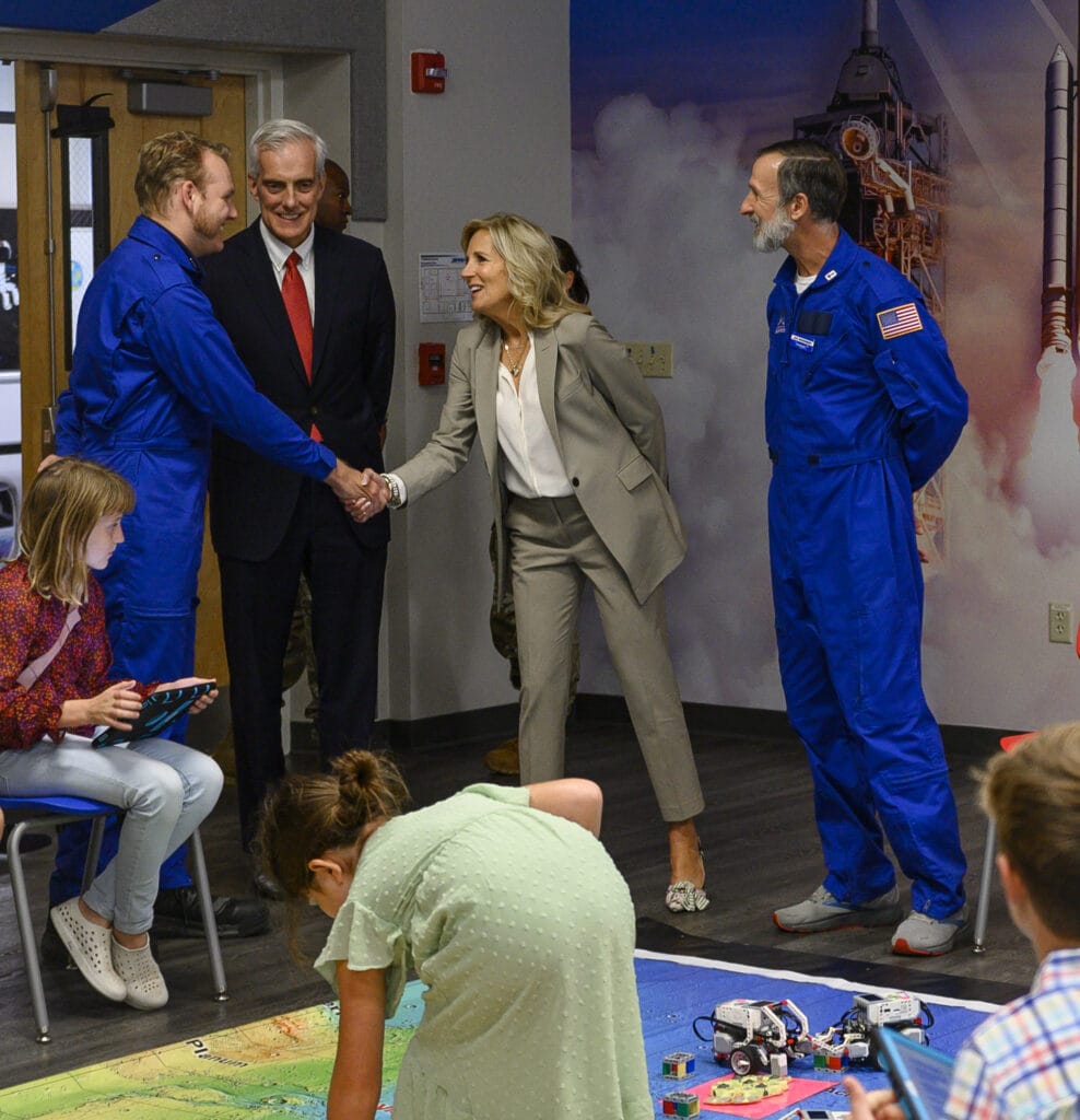 In addition to the roundtable event, she explored the new Department of Defense Starbase program facility. This hands-on program is designed for students from the 5th grade through high school and centers around development in the fields of STEM. Alongside Secretary of Veterans Affairs Denis McDonough, she spoke with local students, observed their Lego creations, and even participated in giving Sphero robot operations a try.