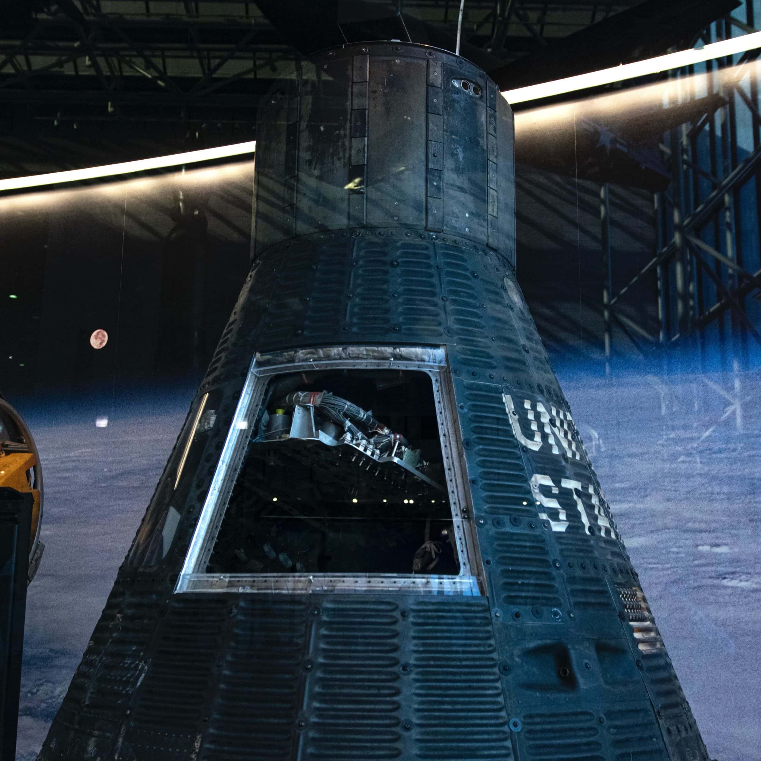 Mercury Friendship 7 was our next stop. There you can view the actual bell-shaped capsule. On Feb. 20, 1962, Astronaut John Glenn made history as the first American to orbit the Earth. The re-entry proved tense due to a faulty heat shield reading but successfully splashed down in the Atlantic close to five hours after liftoff from Cape Canaveral. Seeing the capsule in person is awe-inspiring. Small in size, measuring 6’10” long by 6’2” in diameter, it has a single hatchway and tiny window. The courage Glenn must have had to pioneer this orbital mission makes him a true hero!