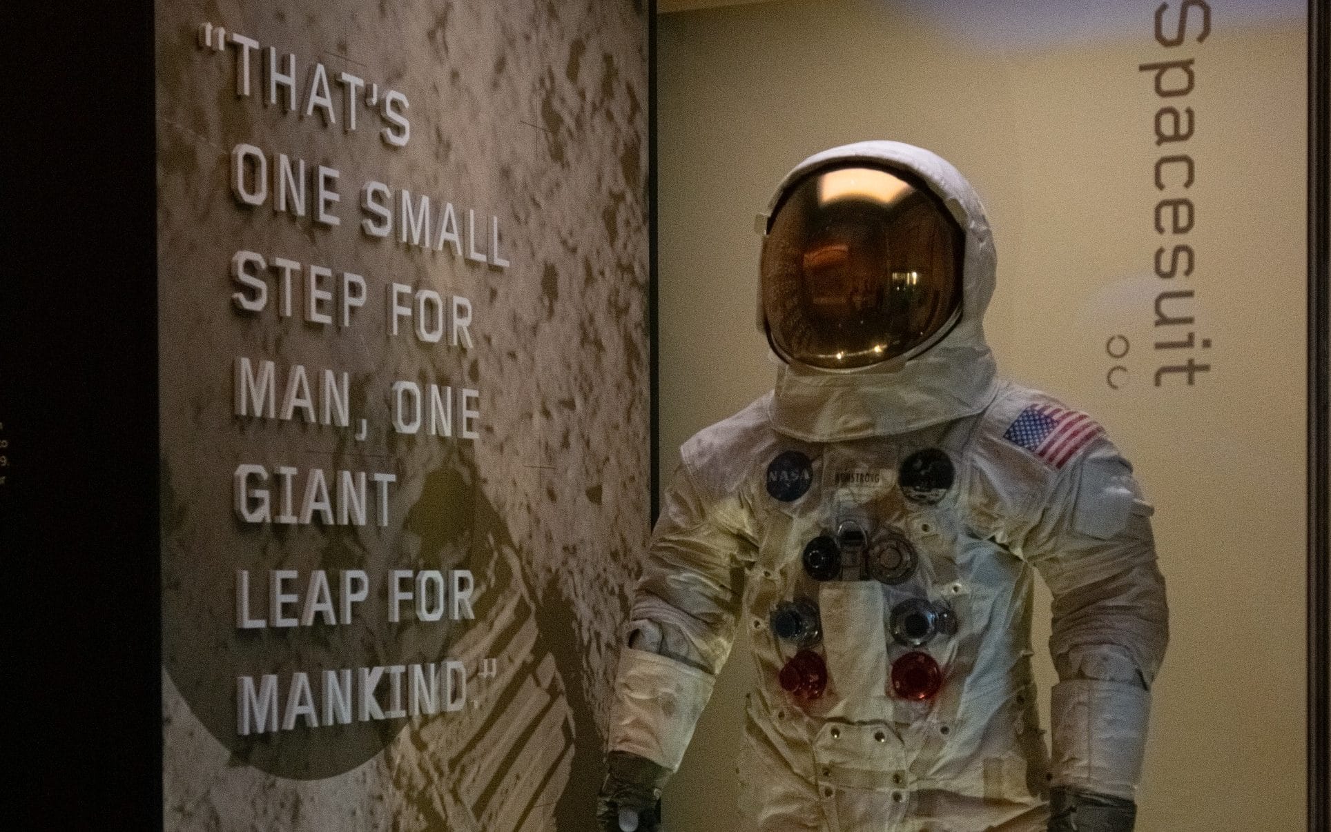 Two notable exhibits we enjoyed were the Wright Flyer and Friendship 7. We began with a self-guided tour of the Wright Flyer exhibit. It details the historical backgrounds of Orville and Wilbur Wright. On Dec. 17, 1903, this first powered airplane was piloted by Orville Wright over the sands of Kitty Hawk, North Carolina. It successfully flew for 12 seconds, traveling 120 feet and inaugurating the aerial age. While exiting this exhibit, you can view the actual Apollo 11 spacesuit worn by Neil Armstrong for his historic moonwalk.