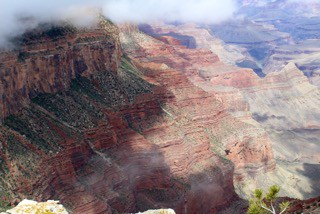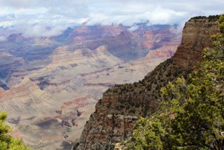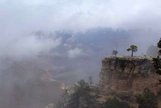 Deciding a hike was in order anyway, we risked hypothermia and went out around 11 a.m., knowing we could jump on a bus if the weather refused to get better. At first, (check the pictures), we saw nothing. Then, lo, the heavens opened and a window in the clouds brought the first glimpse I had of the Grand Canyon since I was 12 years old. And, of course, it’s magnificent (which is why they have more than five million visitors each year). As we progressed through the park, it got slightly warmer, and the clouds were swept away as if they hadn’t completely covered the entire canyon only an hour earlier. Adjectives like spectacular don’t do it justice, and pictures can’t really show the scope and depth (but here they are anyway).