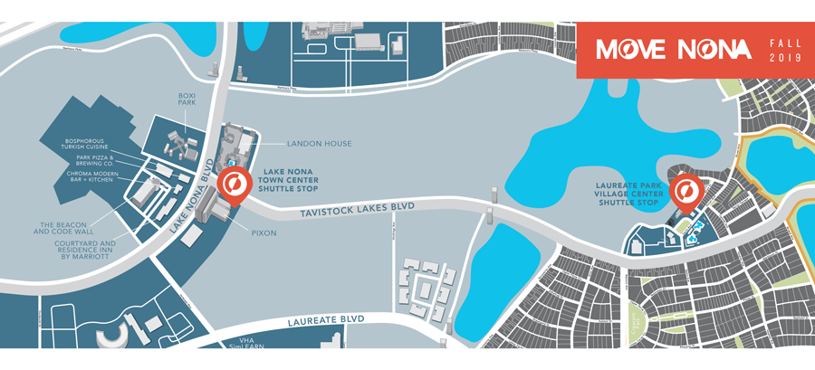 The shuttles will operate between 10 a.m. and 2 p.m. and again between 6 p.m. and 10 p.m. The two stops are currently located at the Lake Nona Town Center, right behind the Pixon Apartments building and the Laureate Park Village Center in front of the Canvas restaurant. The route is a little more than a mile, and the ride takes around 15 minutes, depending on traffic.